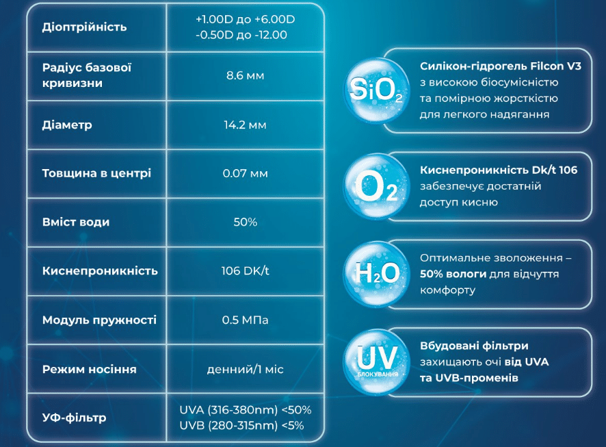 М’які контактні лінзи із силікон-гідрогелю. Вони поєднують в собі високу зручність, тривале зволоження та безпеку для очей завдякі унікальній технології виробництва.